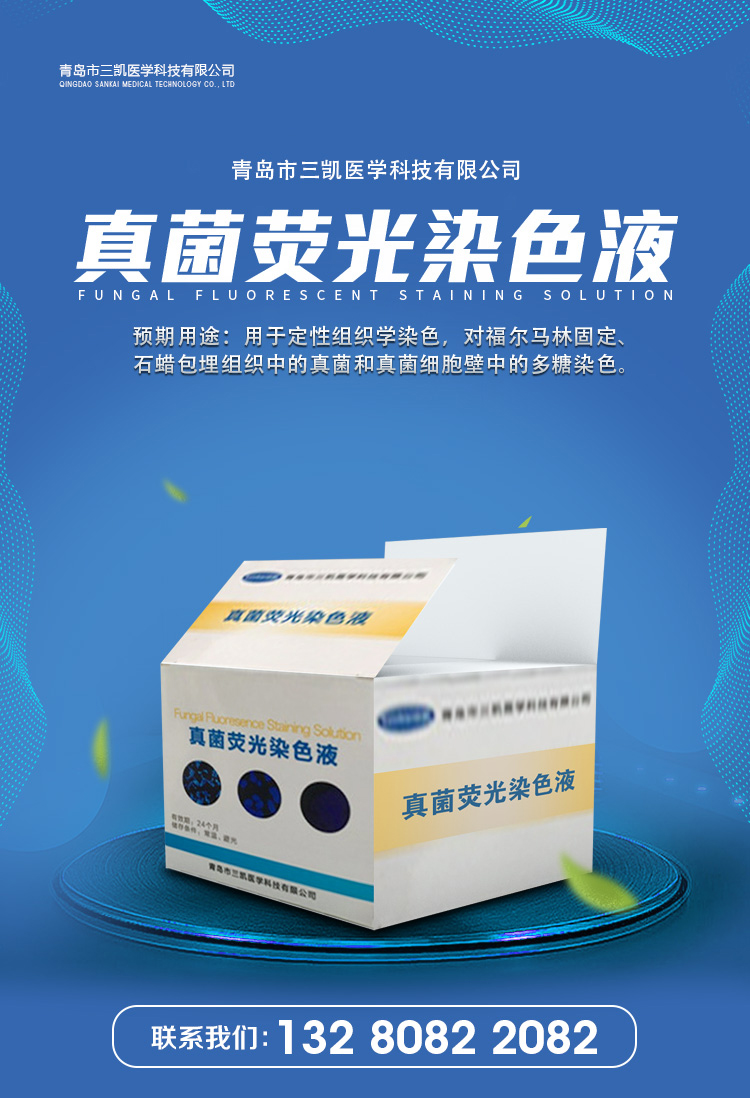 檢查時(shí)可取前房膿液進(jìn)行鏡檢,使用青島三凱研發(fā)的真菌熒光染色液進(jìn)行染色,觀察更加明顯,疾病檢測結(jié)果也更加準(zhǔn)確。